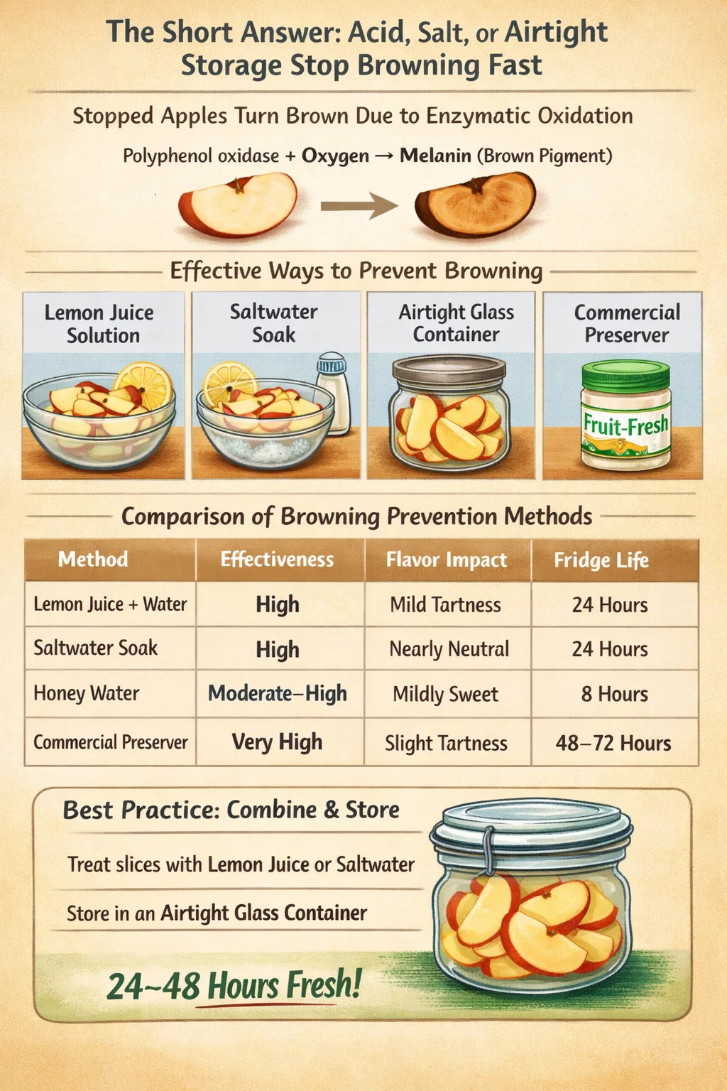 蜂蜜には、グルコースオキシダーゼ、カタラーゼ、さまざまなフラボノイドなど、自然に酸化を抑制するいくつかの化合物が含まれています。希釈したはちみつ水は、リンゴの風味と競合するのではなく、リンゴの風味を補完するマイルドな甘味を加えながら、褐変防止剤として機能します。