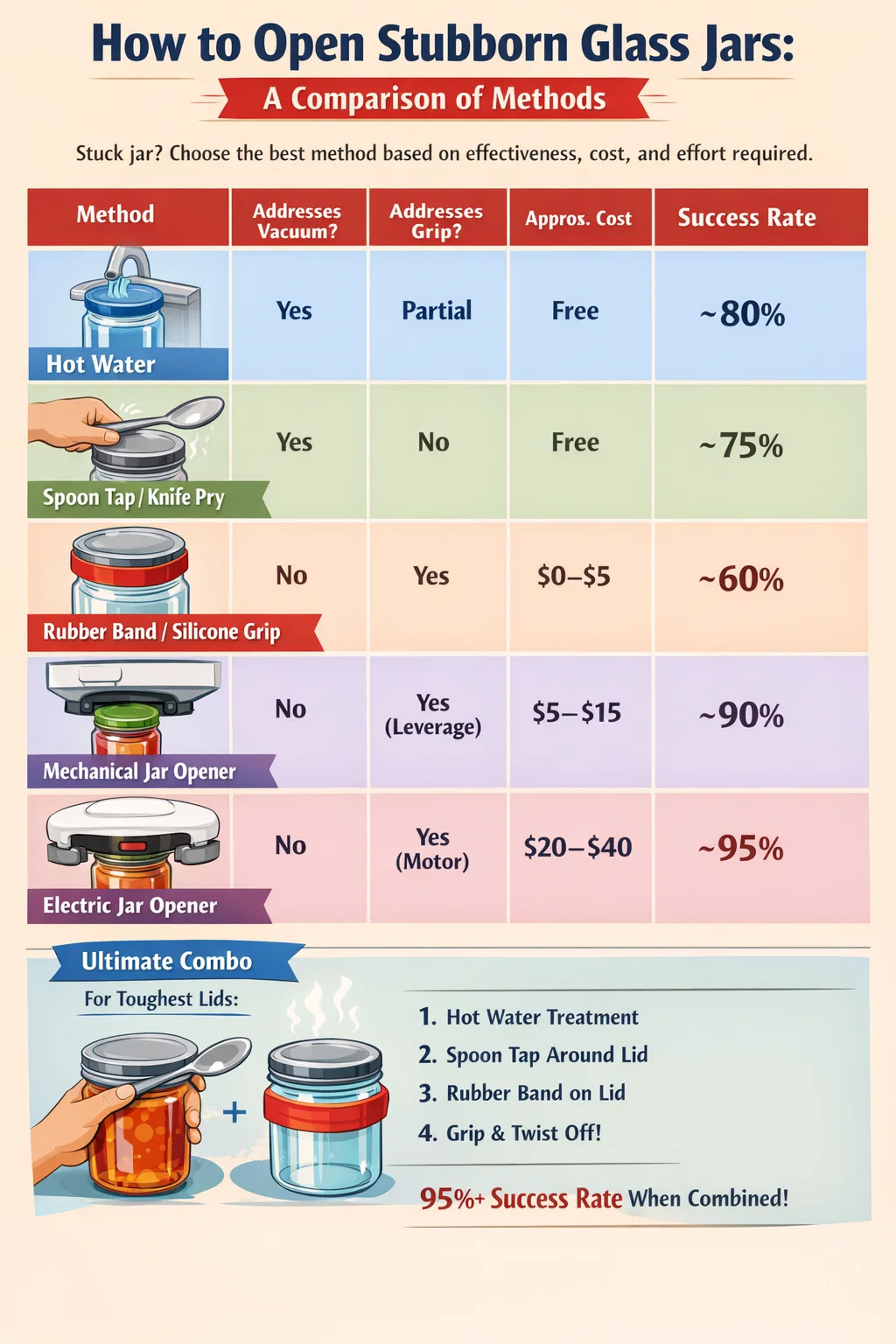 この 5 つのステップのシーケンスは、抵抗の考えられるすべての原因に対処します。熱湯は金属を膨張させて真空を弱め、タッピングはガスケットのシールを破壊し、ゴムバンドは回転グリップを最大化します。実際には、 この組み合わせたアプローチにより、固着したガラス保存瓶の 95% 以上が開きます。 標準的なキッチンの引き出しに入っている以上のツールは必要ありません。