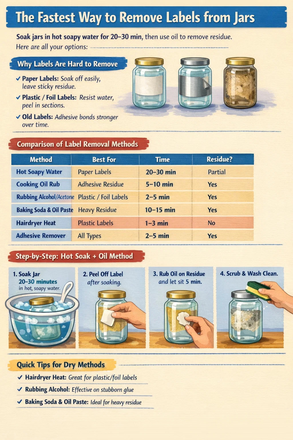 瓶を熱い石鹸水に 20 ~ 30 分間浸すと、ほとんどの紙ラベルがきれいに剥がれます。頑固な接着剤の残留物がある場合は、油(オリーブオイル、ココナッツオイル、または植物油)を粘着部分に直接こすり付けて5分間放置すると、ガラスを傷つけることなく接着剤が溶解します。この 2 段階のアプローチは、リサイクルされたパスタソース瓶、メイソンジャー、広口缶詰瓶など、ほぼすべてのガラス製保存瓶に適用できます。