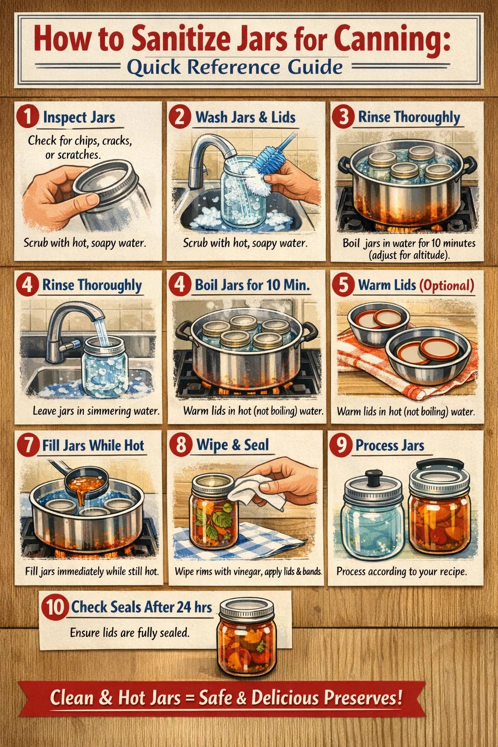 イチゴジャム、オレンジマーマレード、グレープゼリーなどの高糖度、高酸性の製品を 10 分未満で加工するには、事前に完全に滅菌したガラス製缶詰瓶が必要です。熱湯法10分(標高に応じて調整)が標準です。多くのジャム レシピの処理時間は 5 分以内であるため、この事前殺菌ステップはオプションではなく必須です。