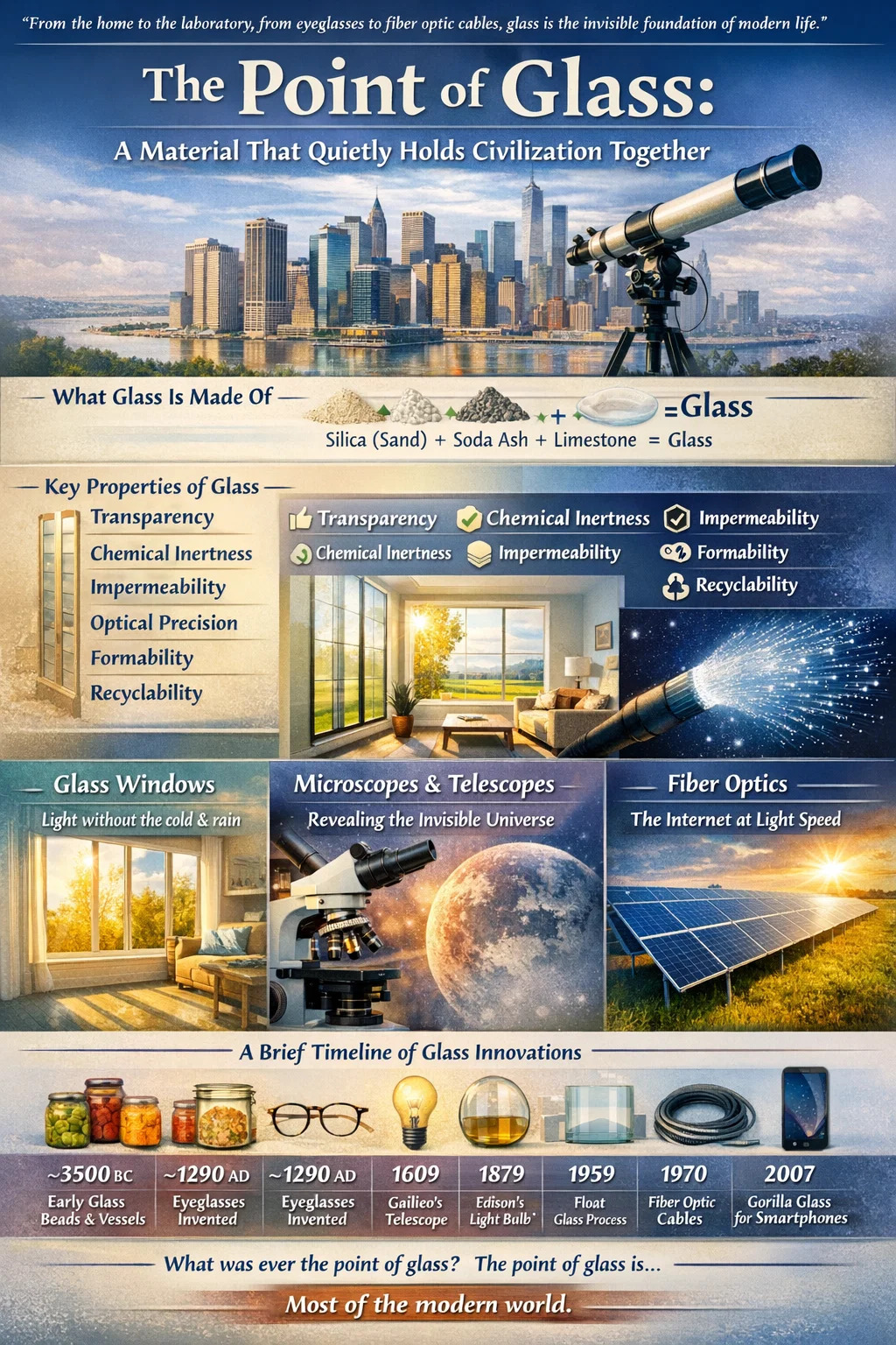 それでは、ガラスには一体何の意味があったのでしょうか?重要なのは、建物内の光、老化した目に回復した視力、初めて明らかになった細菌、見えるようになった宇宙、季節を越えて保存された食料、海底を光速で運ばれる情報、そして指先に反応するポケットのスクリーンだった。ガラスの点は現代世界のほとんどです。